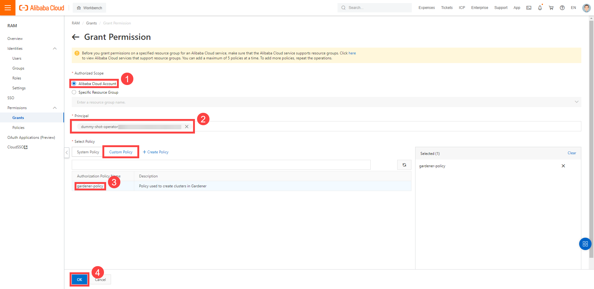 To be able to add shoot clusters to this project, you must first create a technical user on Alibaba Cloud with sufficient permissions.
