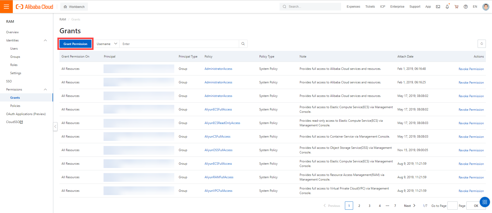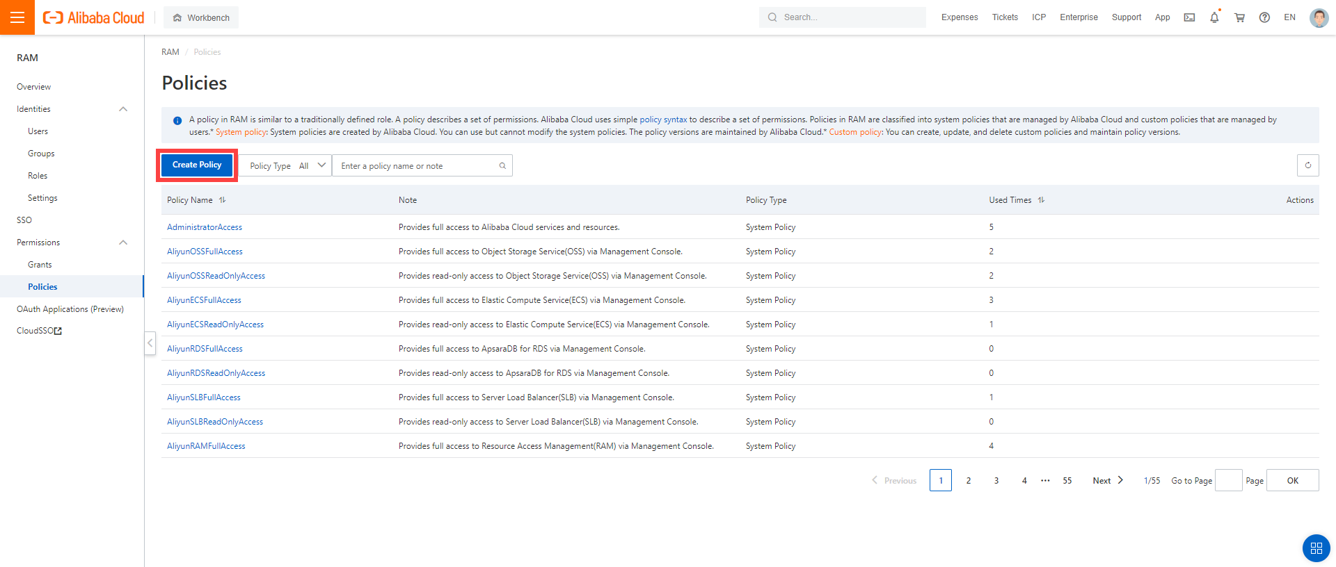 Log on to your Alibaba account and choose RAM > Permissions > Policies.