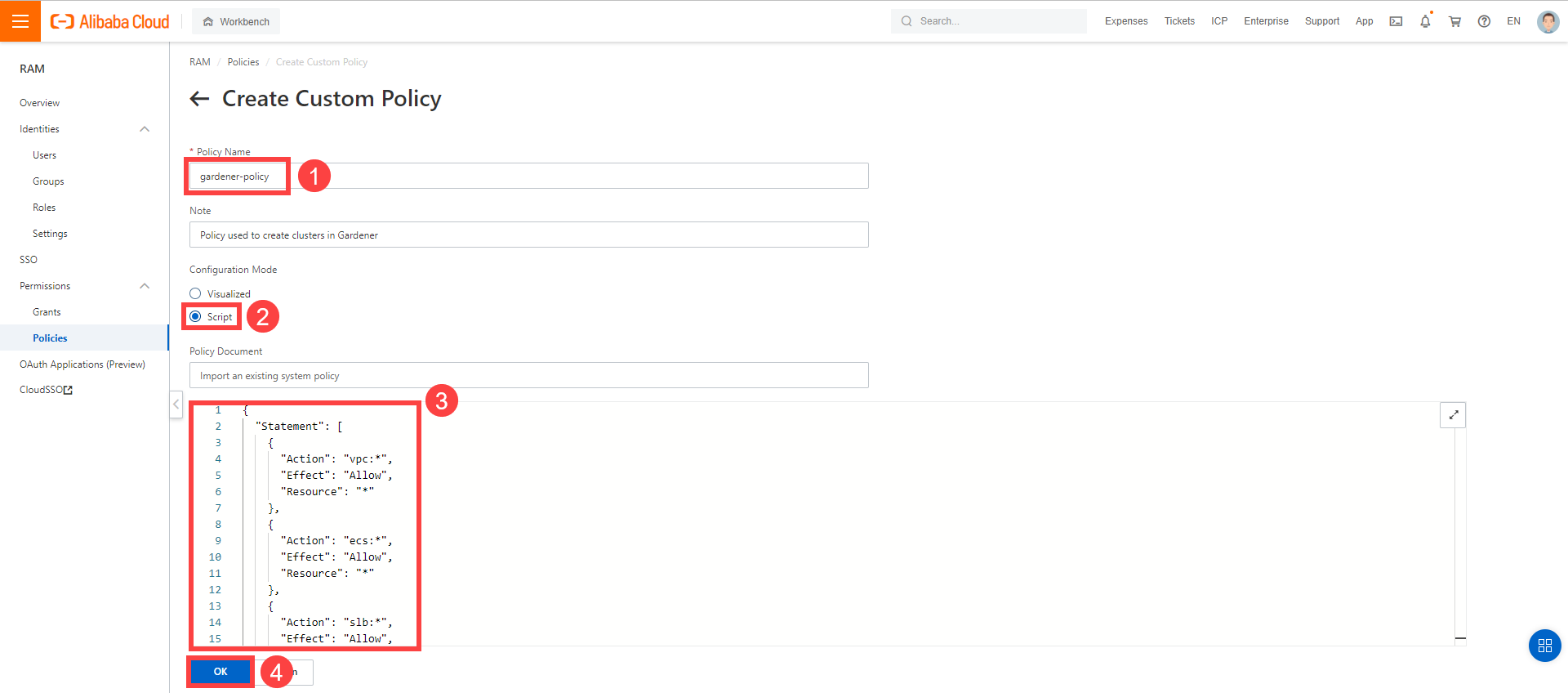Script.Paste the policy that you copied from the Gardener dashboard to this custom policy.