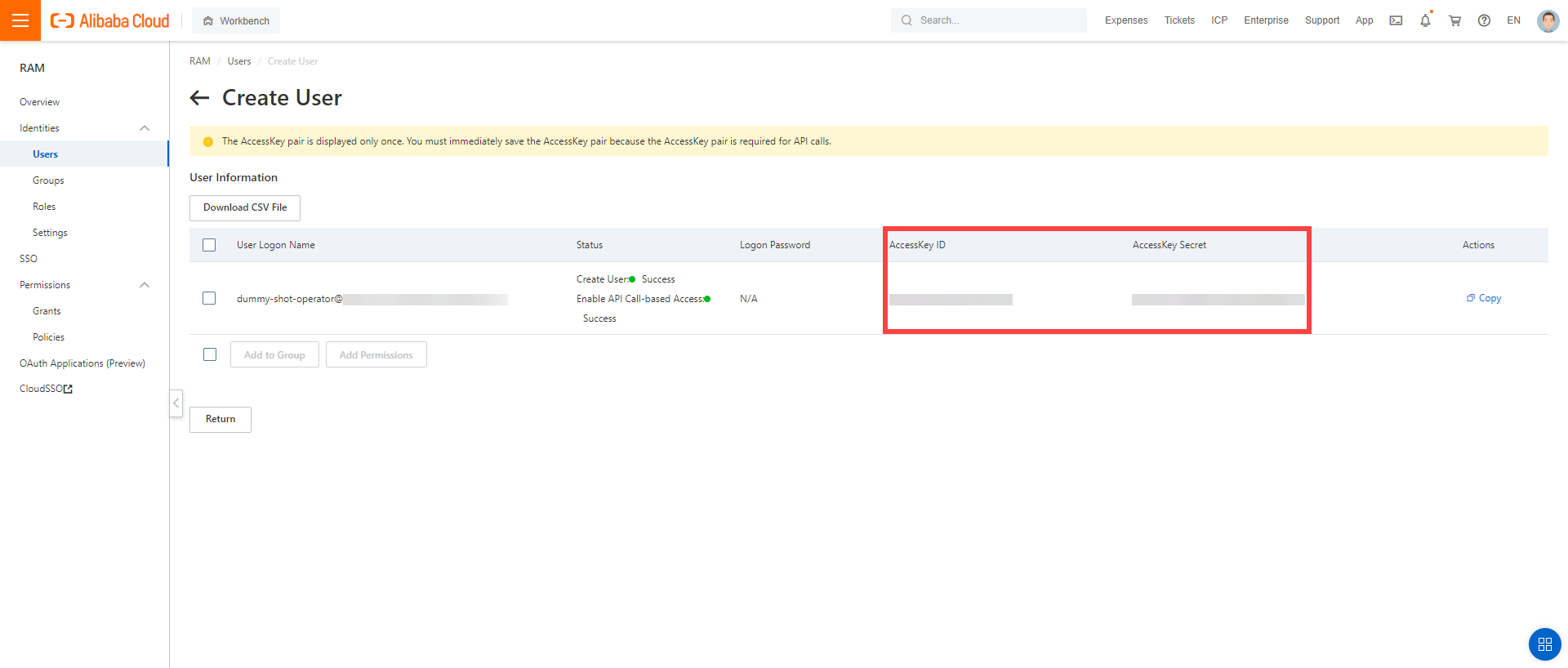 AccessKeyIdandAccessKeySecretare generated and displayed. Remember to save them. TheAccessKeyis used later to create secrets for Gardener.